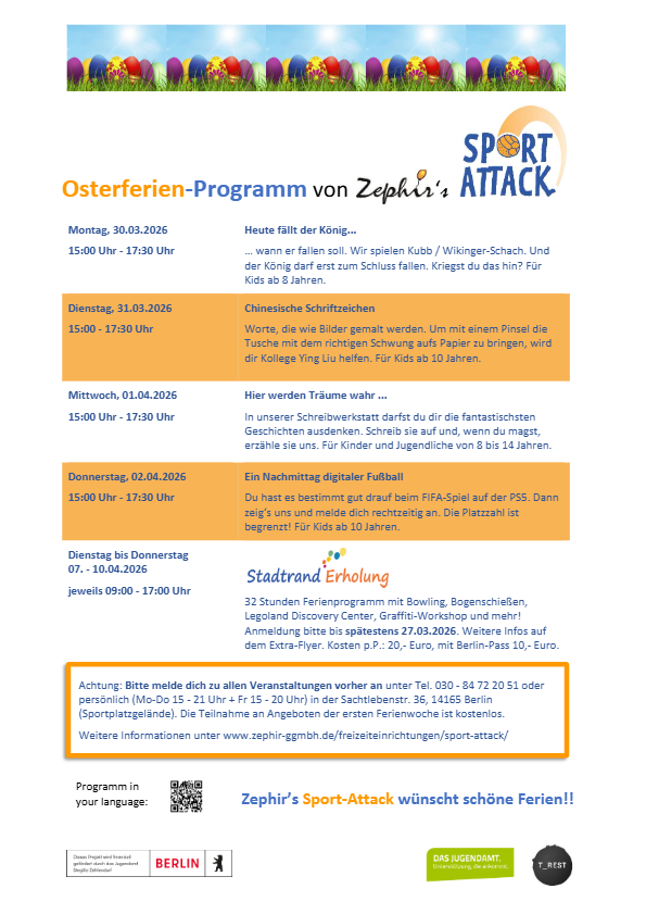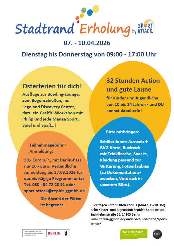 Tel. 030 – 84 72 20 51 oder persönlich Mo – Do 15:00 – 21:00 Uhr + Fr 15:00 – 20:30 Uhr bei Zephir’s Sport-Attack in der Sachtlebenstr. 36, 14165 Berlin (Sportplatzgelände). Weitere Informationen zu unseren Angeboten unter www.zephir-ggmbh.de/kinder-schule-freizeit/sport-attack/.