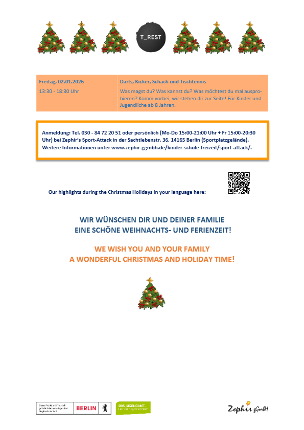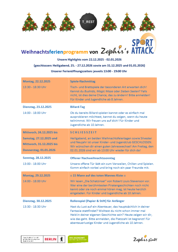 Tel. 030 – 84 72 20 51 oder persönlich Mo – Do 15:00 – 21:00 Uhr + Fr 15:00 – 20:30 Uhr, in den Weihnachtsferien von 13:00 – 19:00 Uhr, bei Zephir’s Sport-Attack in der Sachtlebenstr. 36, 14165 Berlin (Sportplatzgelände). Informationen zu unseren Angeboten findest du unter www.zephir-ggmbh.de/kinder-schule-freizeit/sport-attack/.